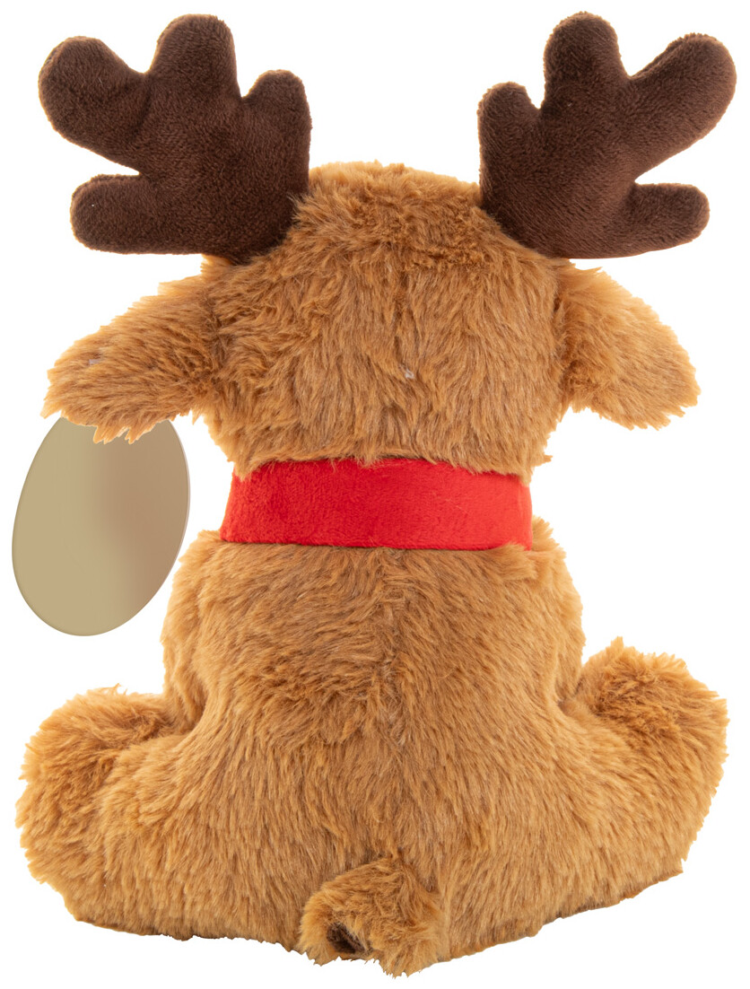 RPET plyšový vánoční sob se šálou. S tisknutelnou visačkou z kraftového papíru na uchu.