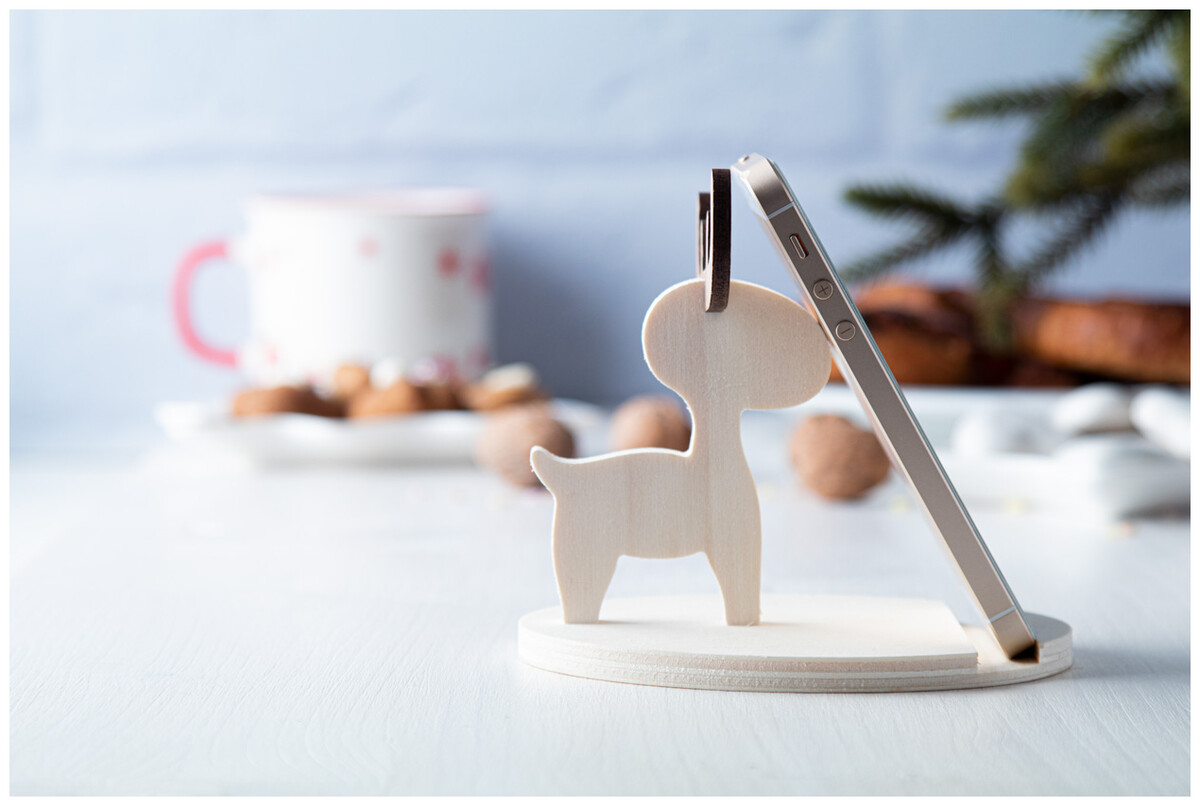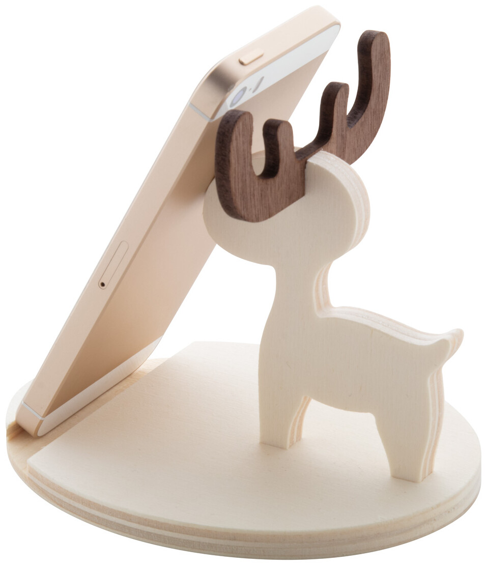 Stojánek na mobil z březové překližky ve tvaru soba. Dodáváno rozložené.