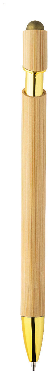 Bambusové dotykové kuličkové pero s lesklými kovovými detaily a barevným dotykovým stylusem. S modrou náplní.