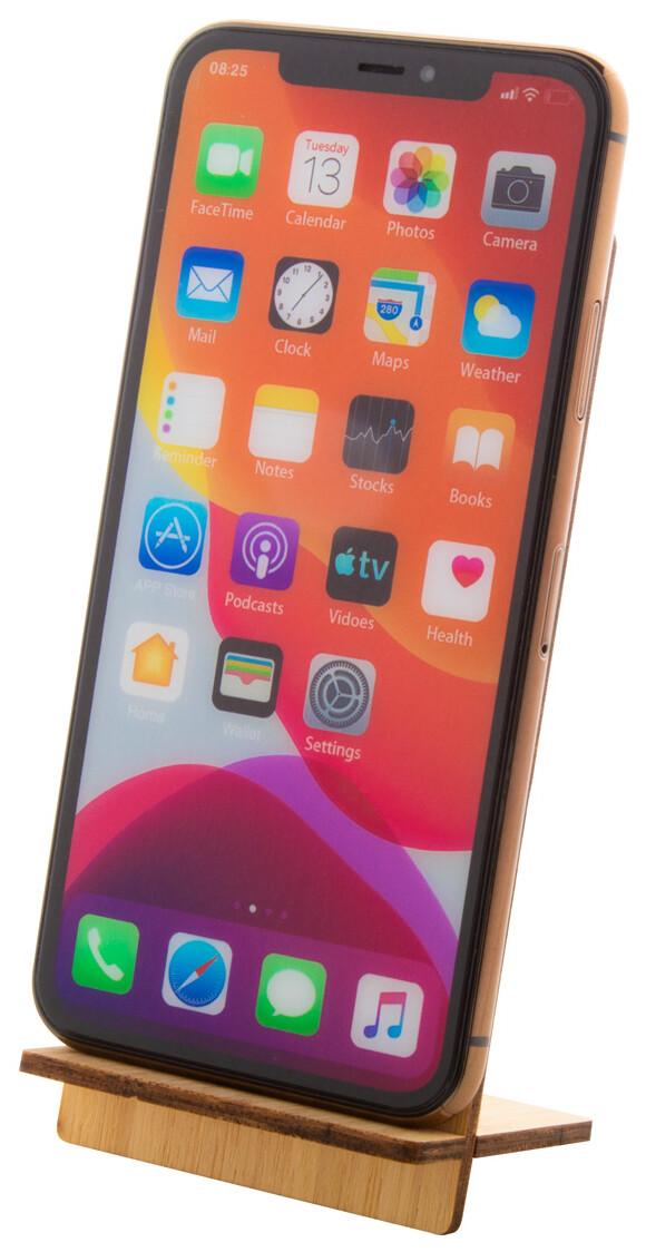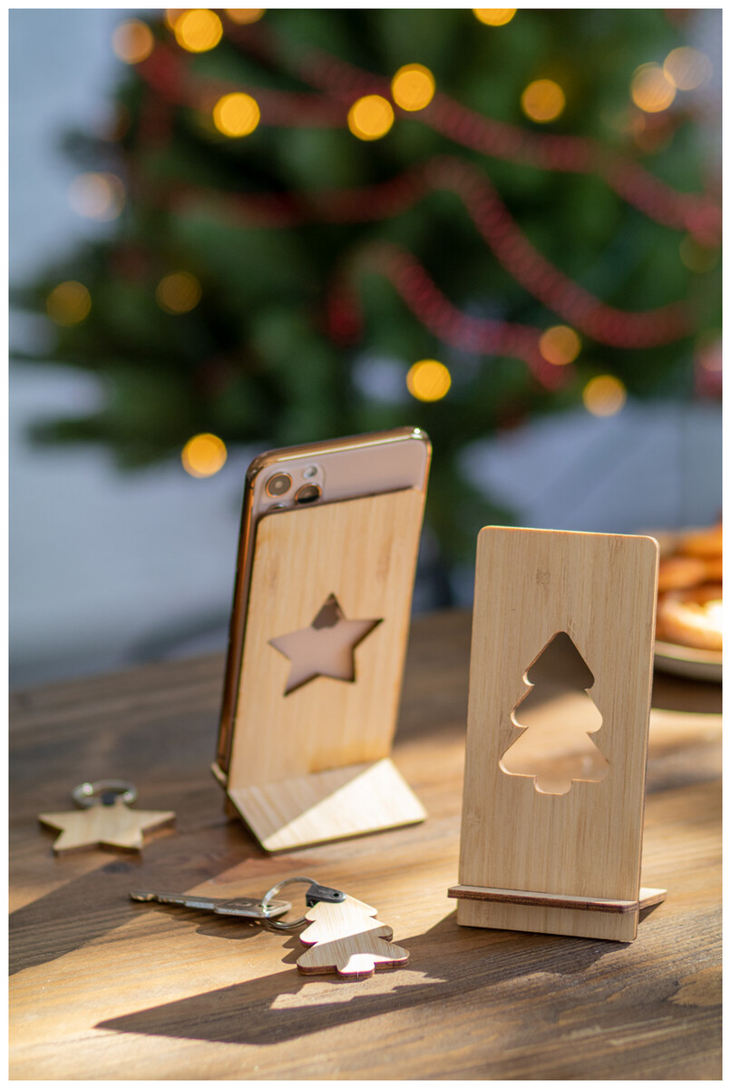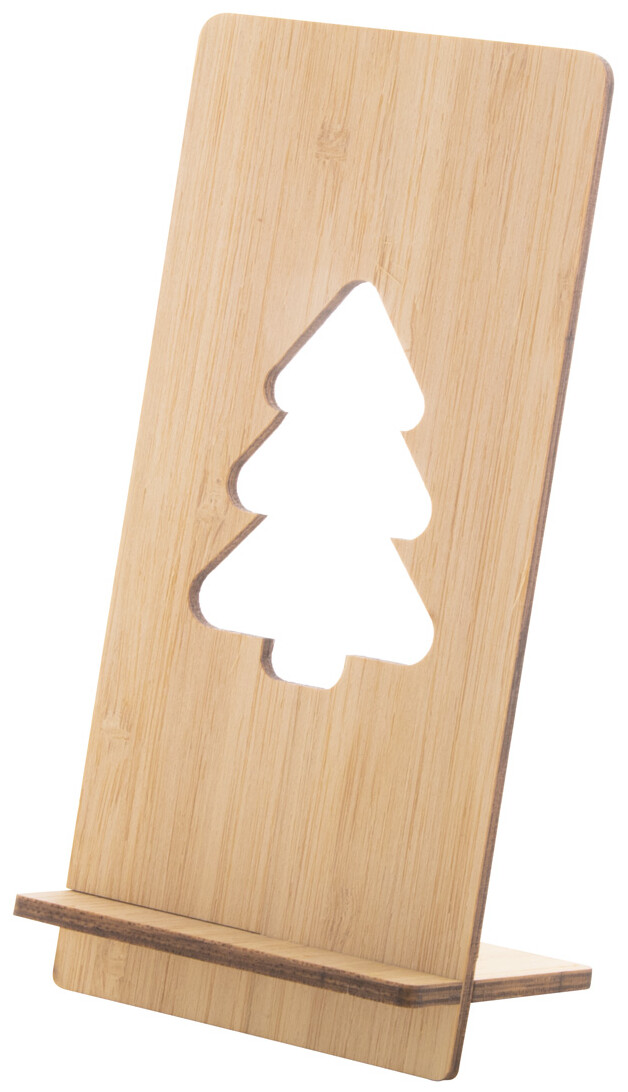 Stojánek na mobil z bambusové překližky s vyřízlým vánočním motivem. Dodáváno rozložené.