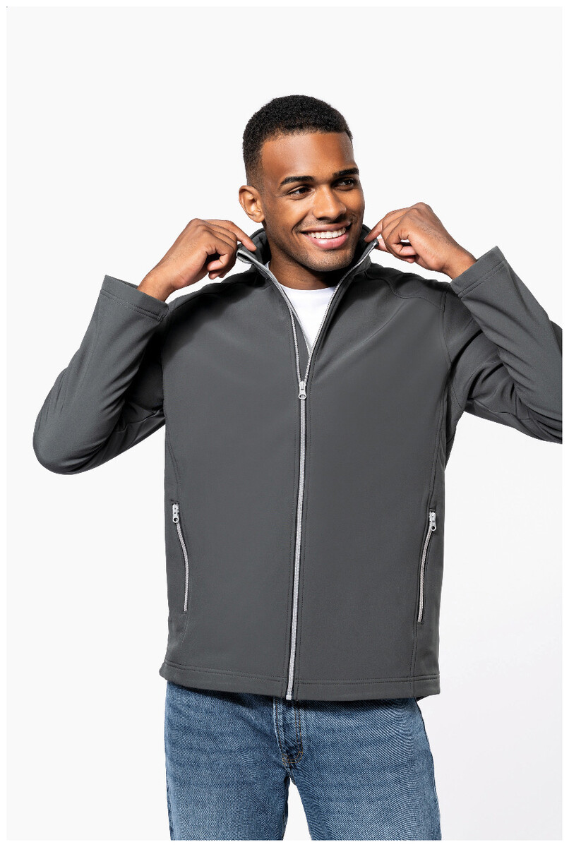 Dvouvrstvá softshellová bunda na zip s bočními kapsami na zip. S kontrastními zipy. Vodoodpudivá tkanina. Vnější strana: 95 % polyester a 5 % elastan. Vnitřní strana: 100% polyester micro polar fleece. Materiál: 300 g/m2. Výrobek značky Kariban.