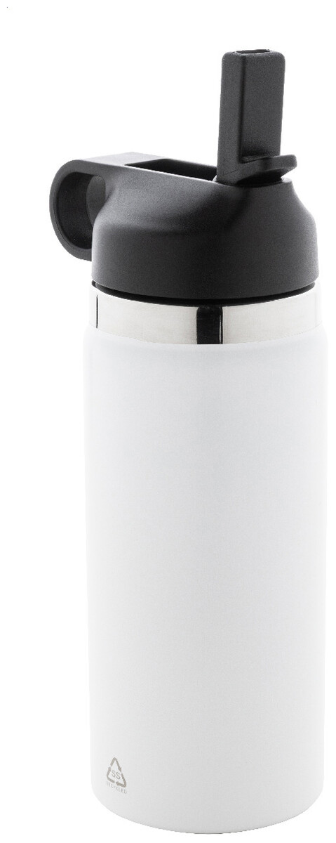 Dvoustěnná vakuová láhev z recyklované nerezové oceli s odklápěcím víčkem z PP, rukojetí a integrovaným brčkem. 500 ml.