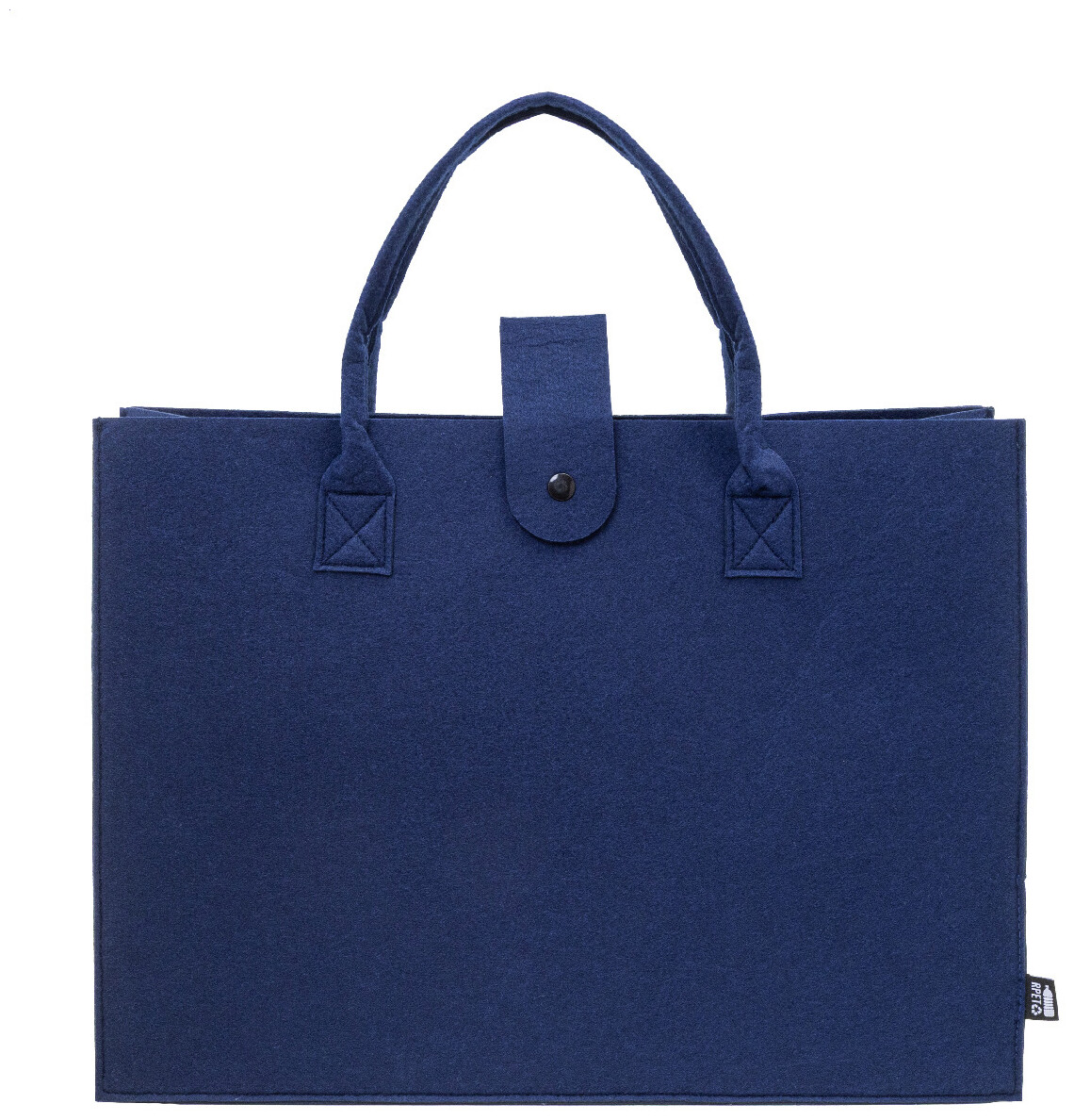 Nákupní taška z RPET plsti s klínkem, zapínáním na knoflíky a krátkými uchy. S výraznou etiketou z RPET.