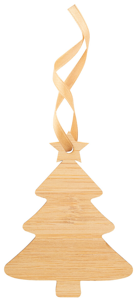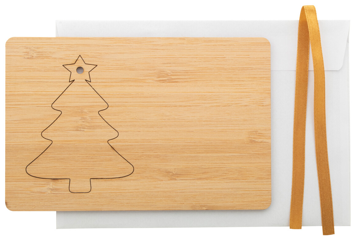Vánoční přání v bambusové překližce s vylamovací ozdobou na vánoční stromeček se zlatou stuhou. Včetně poštovní obálky C6. Dodáváno s oddělenou stuhou.