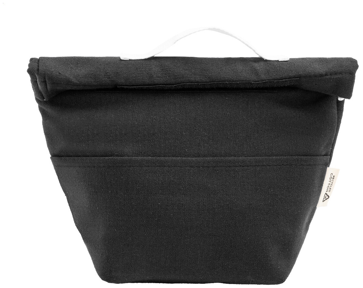 Chladicí taška z recyklovaného plátna s rolovacím vrškem, přední kapsou, hliníkovou výplní a zapínáním na suchý zip. 70 % recyklované bavlny a 30 % RPET polyesteru. S výrazným štítkem recyklované bavlny.