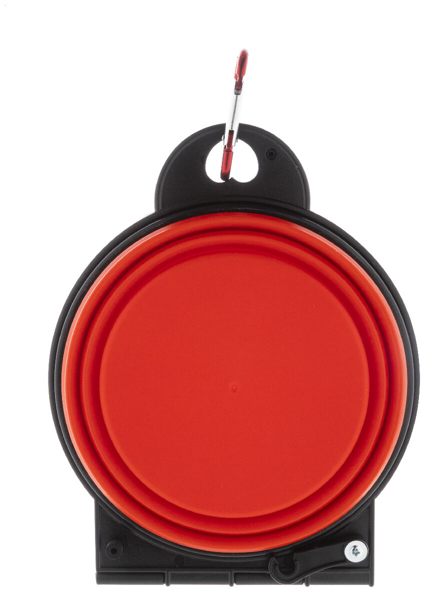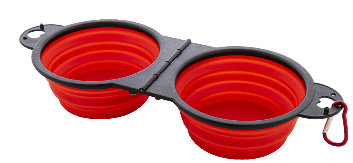 Skládací miska pro domácí mazlíčky z odolného TPE se dvěma přihrádkami o objemu 450 ml a barevně sladěnou hliníkovou karabinou.