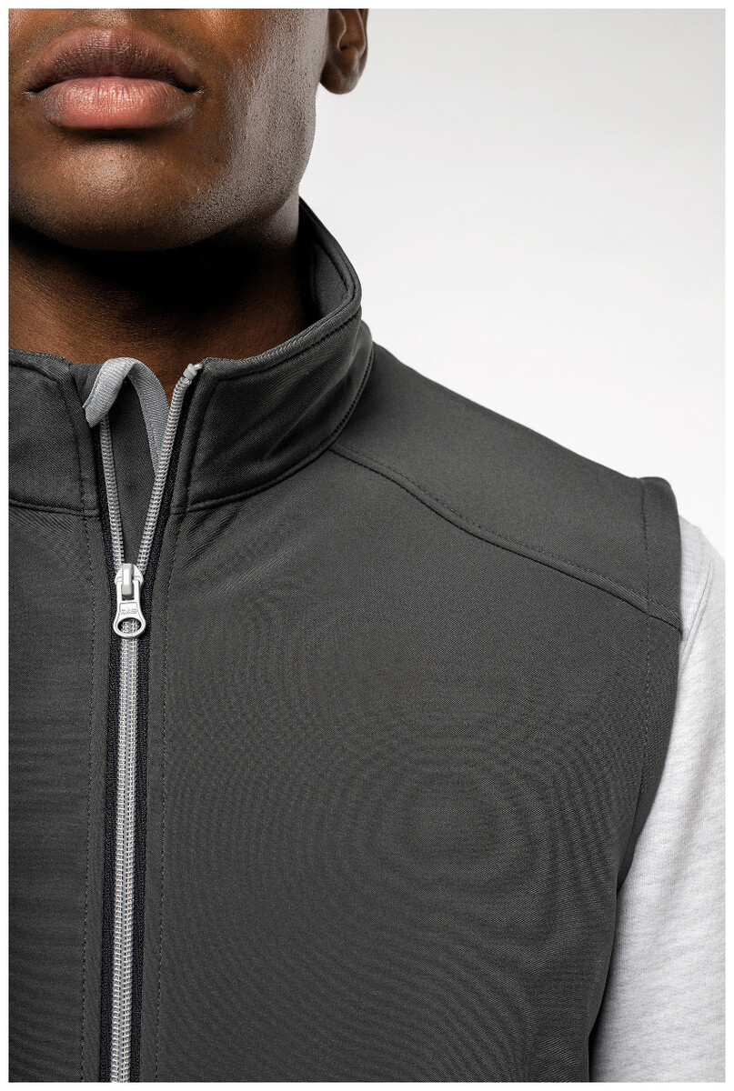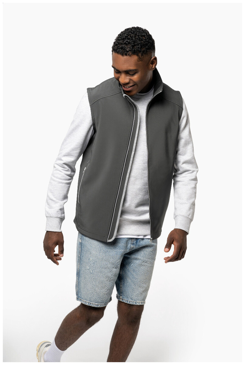 Dvouvrstvá softshellová vesta na zip s bočními kapsami na zip. S kontrastními zipy. Vodoodpudivá tkanina. Vnější strana: 95 % polyester a 5 % elastan. Vnitřní strana: 100% polyester micro polar fleece. 300 g/m2. Výrobek značky Kariban.