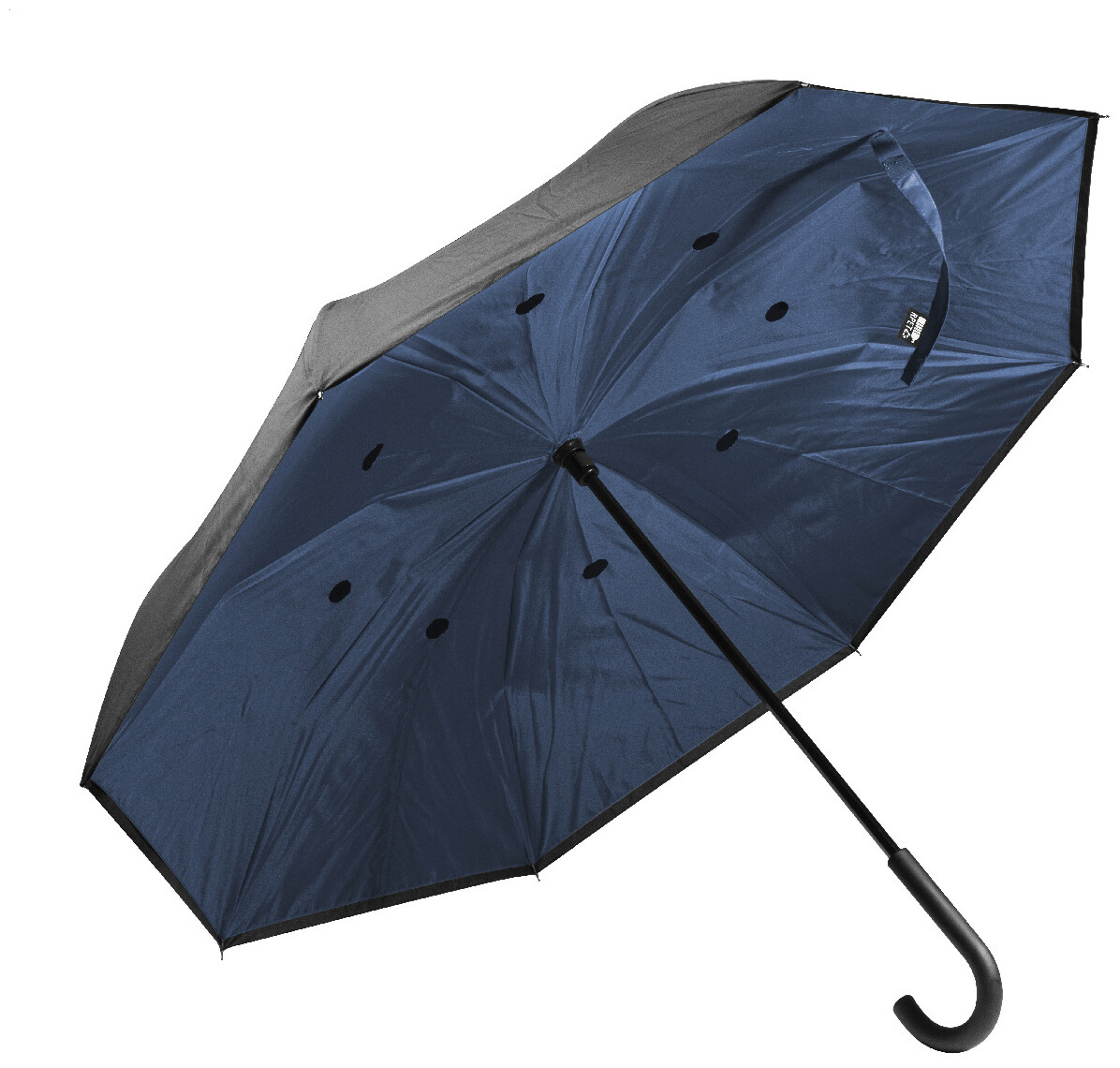 Manuální větruodolný deštník s reverzním otevíráním, 8 panely, dvouvrstvou dvoubarevnou stříškou, kovovým rámem, žebry ze skelných vláken a pogumovanou rukojetí. Materiál: 190T RPET pongee. S výrazným štítkem RPET.