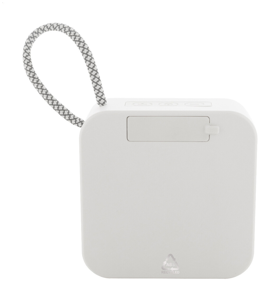 Bezdrátový reproduktor z recyklovaného ABS s popruhem na nošení, kovovou síťovinou a dobíjecí baterií (300 mAh). S funkcí přehrávání MP3 karet micro SD. Včetně nabíjecího kabelu USB.