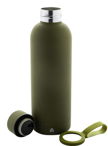 Dvoustěnná vakuová láhev z recyklované nerezové oceli s pogumovanou úpravou a silikonovým páskem, 500 ml.
