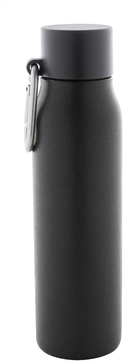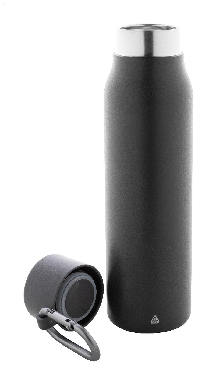 Dvoustěnná vakuová láhev z recyklované nerezové oceli s víčkem z PP a karabinou z recyklovaného hliníku. 500 ml.