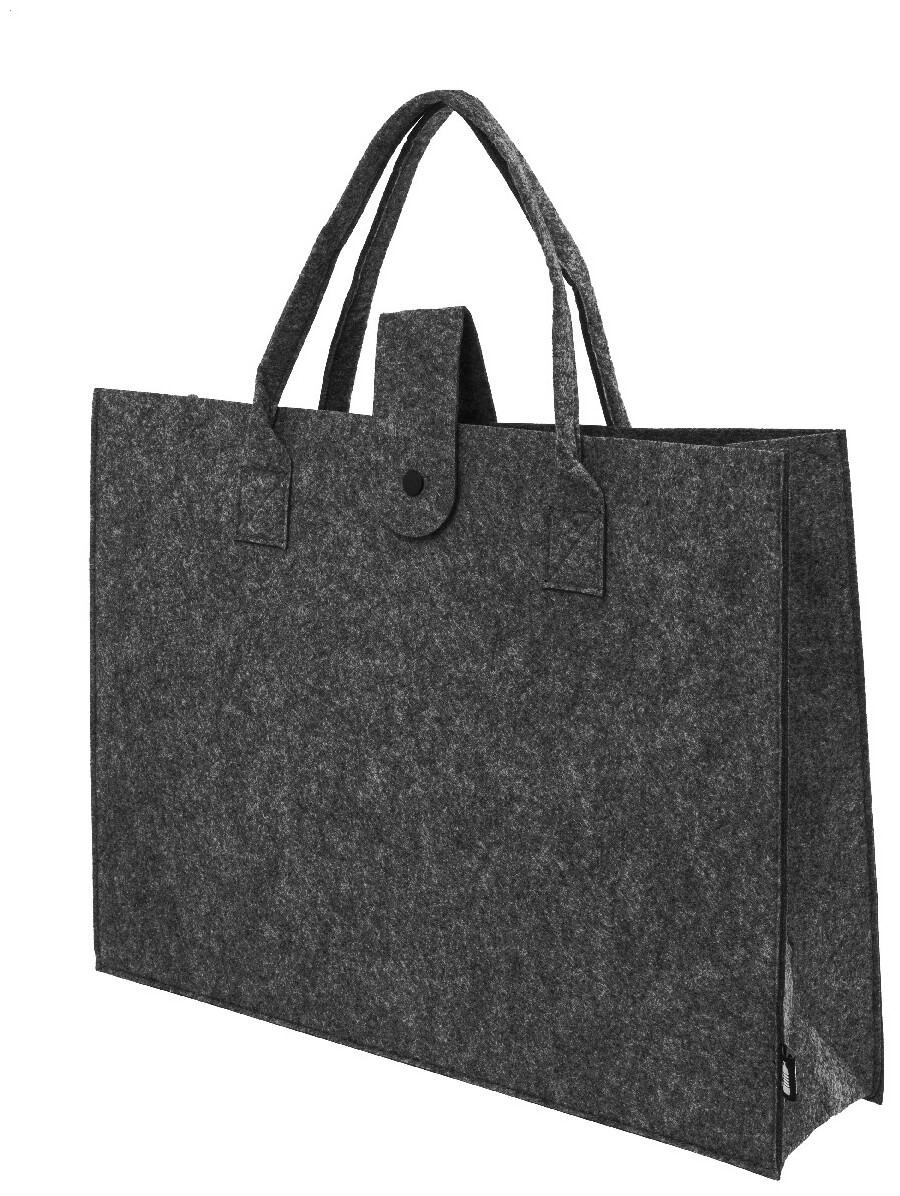 Nákupní taška z RPET plsti s klínkem, zapínáním na knoflíky a krátkými uchy. S výraznou etiketou z RPET.