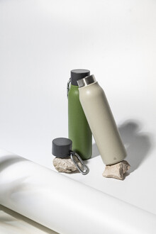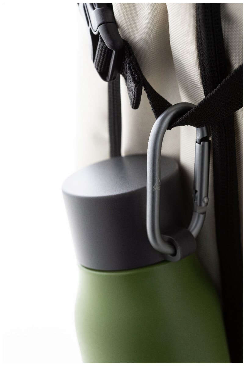 Dvoustěnná vakuová láhev z recyklované nerezové oceli s víčkem z PP a karabinou z recyklovaného hliníku. 500 ml.