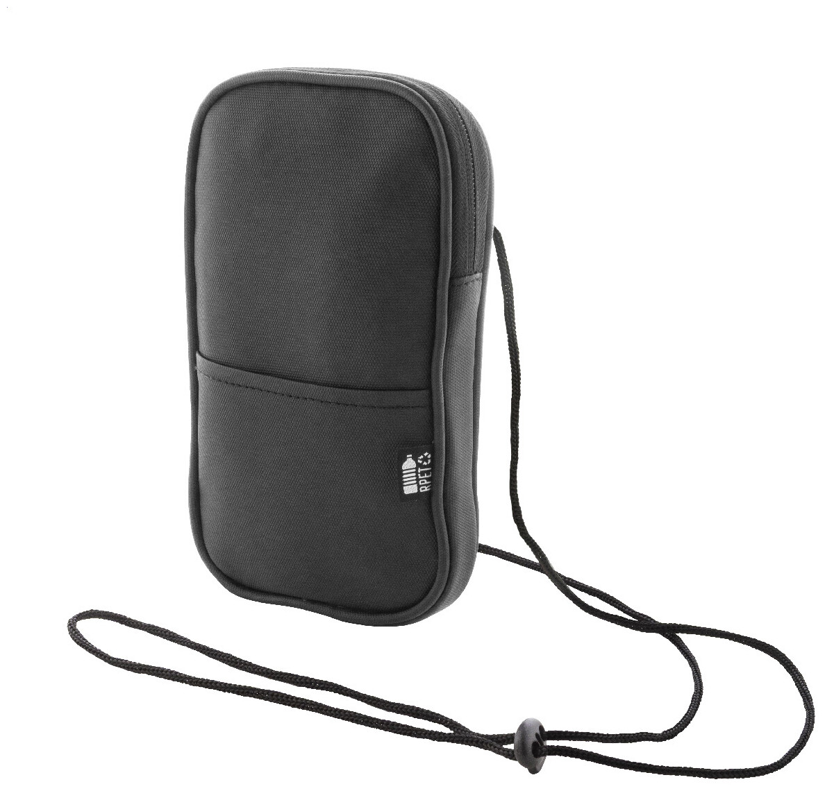 Voděodolná RPET crossbody taška na mobilní telefon s hlavní přihrádkou na zip, přední kapsou a nastavitelnou šňůrkou. Polyester RPET 600D potažený PU, s výrazným štítkem RPET.