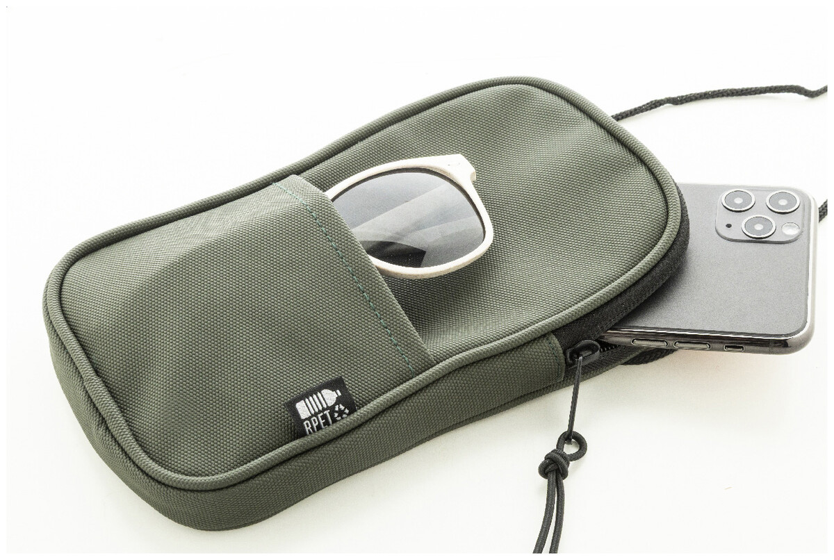 Voděodolná RPET crossbody taška na mobilní telefon s hlavní přihrádkou na zip, přední kapsou a nastavitelnou šňůrkou. Polyester RPET 600D potažený PU, s výrazným štítkem RPET.