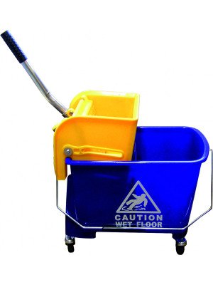 Kbelík je na kolečkách s dělící přepážkou, která odděluje čistou vodu s čistícím prostředkem od špinavé. Kbelík o objemu 20litrů, modrá barva, obsahuje ždímač.