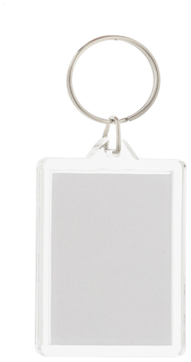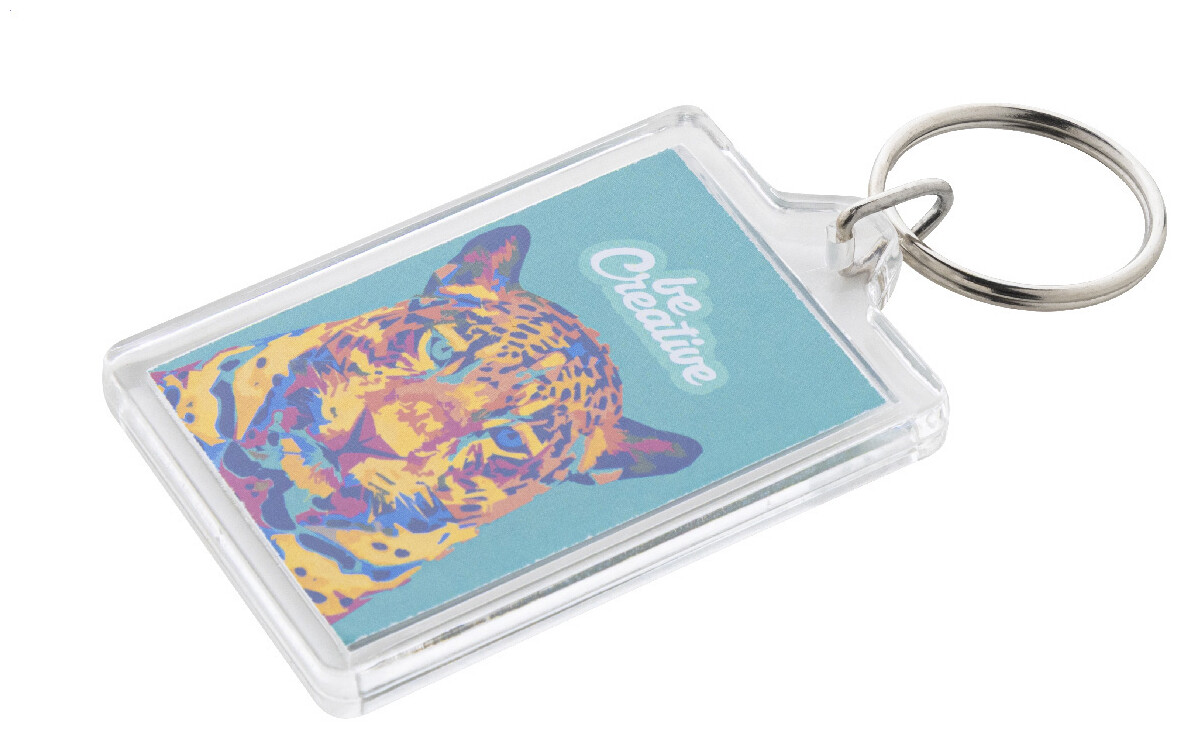Přívěšek na klíče ve tvaru obdélníku z akrylu s barevnou papírovou vložkou na zakázku a kovovým kroužkem. Cena zahrnuje digitální tisk na obou stranách, nezahrnuje tiskovou přípravu. Min. mn.: 100 ks.