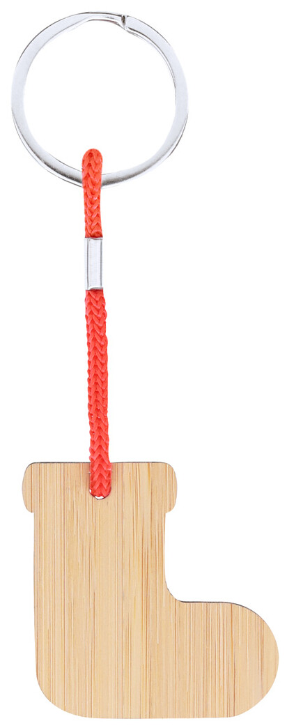 Vánoční přívěšek na klíče z bambusové překližky s červeným provázkem a kovovým kroužkem.