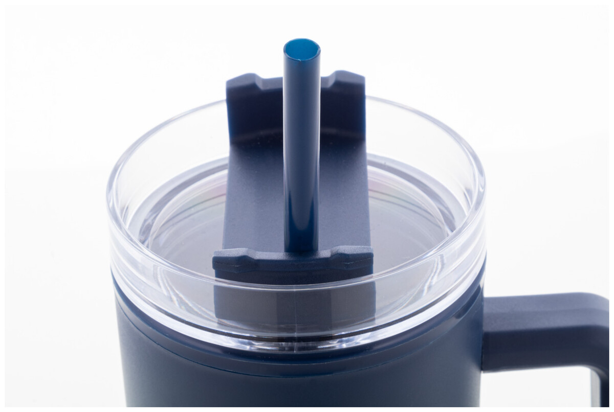 Dvoustěnný termo hrnek z recyklovaného PP plastu s plastovým víčkem na pití a brčkem. 900 ml.