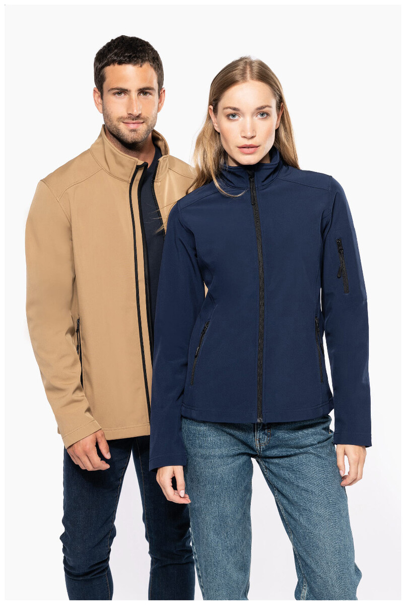 Třívrstvá, prodyšná, větru a vodě odolná softshellová bunda na zip s rukávy na zip a bočními kapsami. S prodyšnou střední vrstvou a vnitřní vrstvou z mikropolaru. Materiál: 95 % polyester a 5 % elastan, 300 g/m2. Výrobek značky Kariban.