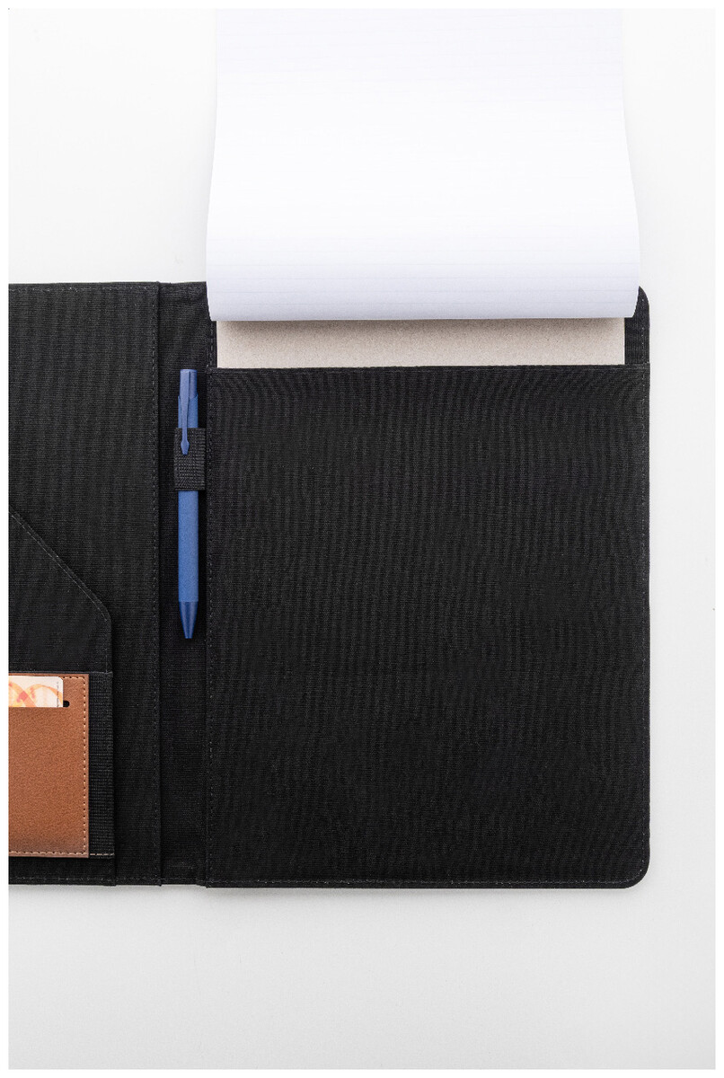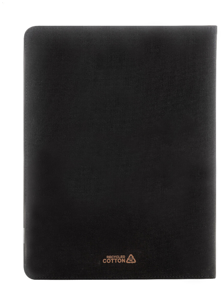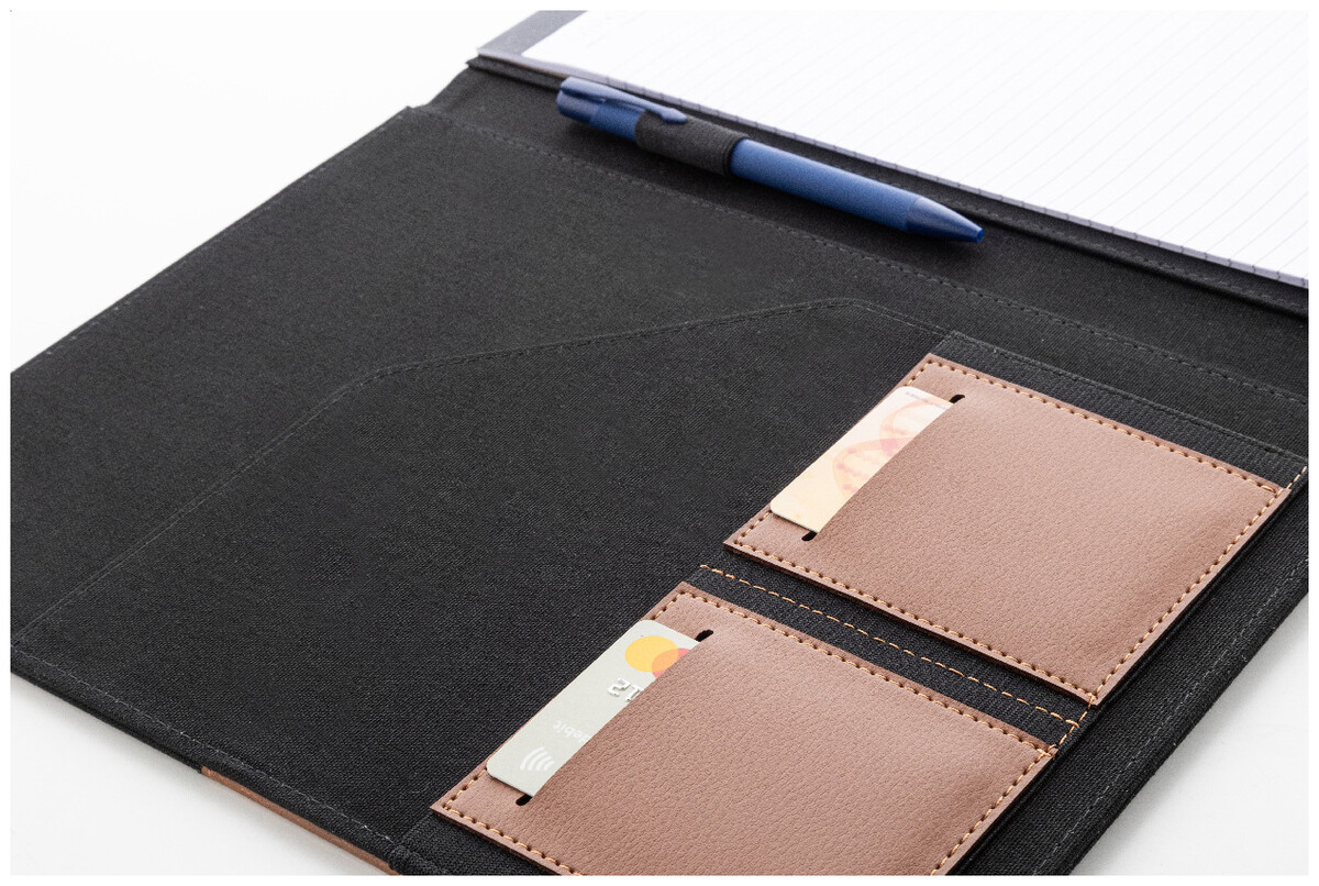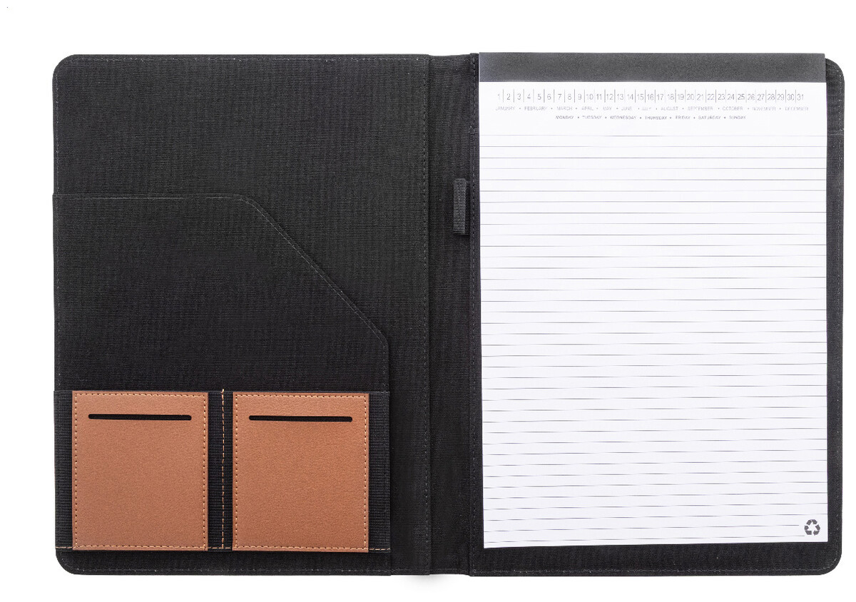 Složka na dokumenty A4 z recyklovaného plátna a recyklované umělé kůže s několika předními a vnitřními kapsami. S blokem na 20 linkovaných listů z recyklovaného papíru. 70 % recyklované bavlny a 30 % RPET polyesteru.