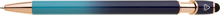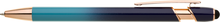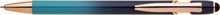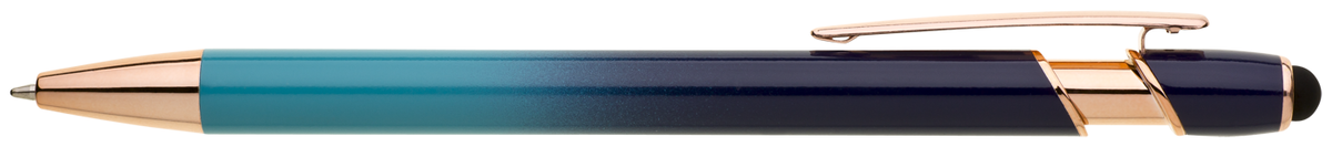 Elegantní kuličkové pero s kovovým tělem v moderním modro-tyrkysovém přechodu a detaily z růžového zlata. Na konci má dotykovou část pro ovládání mobilu či tabletu. Výsledný efekt laserového značení je světle stříbrný až bílý. Náplň X-20 modře píšící.