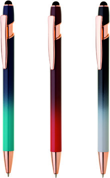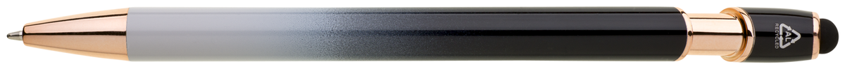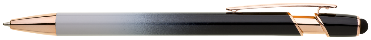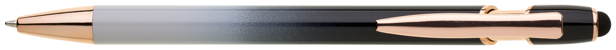 Elegantní kuličkové pero s kovovým tělem v moderním černo-šedivém přechodu a detaily z růžového zlata. Na konci má dotykovou část pro ovládání mobilu či tabletu. Výsledný efekt laserového značení je světle stříbrný až bílý. Náplň X-20 modře píšící.