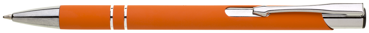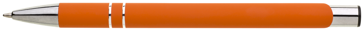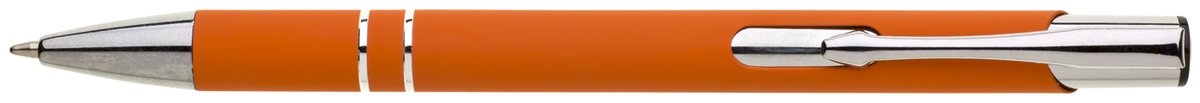 Hliníková propiska se stříbrnými doplňky a měkkým pogumovaným soft povrchem v oranžové barvě. Modře píšící.