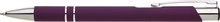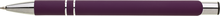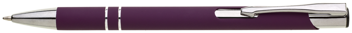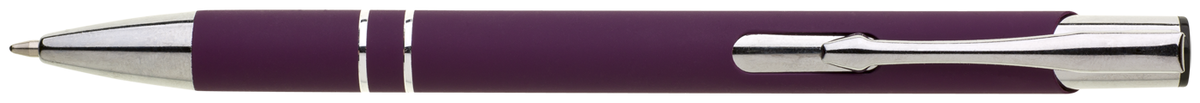 Hliníková propiska se stříbrnými doplňky a měkkým pogumovaným soft povrchem ve fialové barvě. Modře píšící.