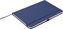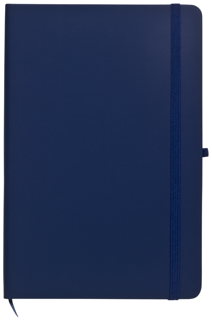 Zápisník A5 v modrých deskách z PU materiálu má 80 linkovaných listů. Blok má uzavírací gumičku, poutko na propisku a textilní záložku v barvě desek.