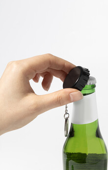 Přívěsek na klíče ve tvaru víčka z recyklovaného ABS plastu s otvírákem.