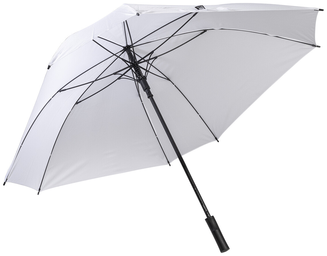 Velký automatický větruodolný čtvercový deštník s celolaminátovou tyčí a rámem, pogumovanou ABS rukojetí. 190T RPET pongee. S charakteristickým RPET štítkem.