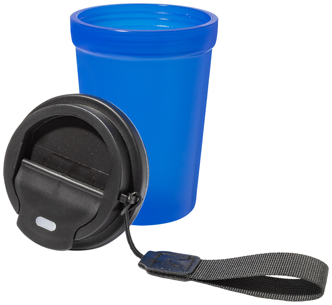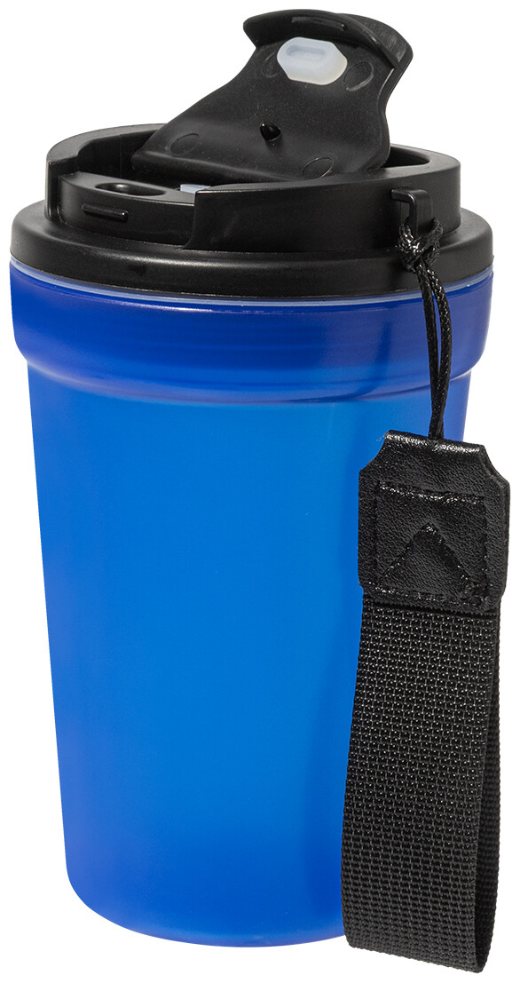 Jednostěnný cestovní kelímek z PP plastu s matnou povrchovou úpravou, víčkem na pití a poutkem z RPET polyesteru. 400 ml.