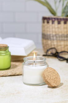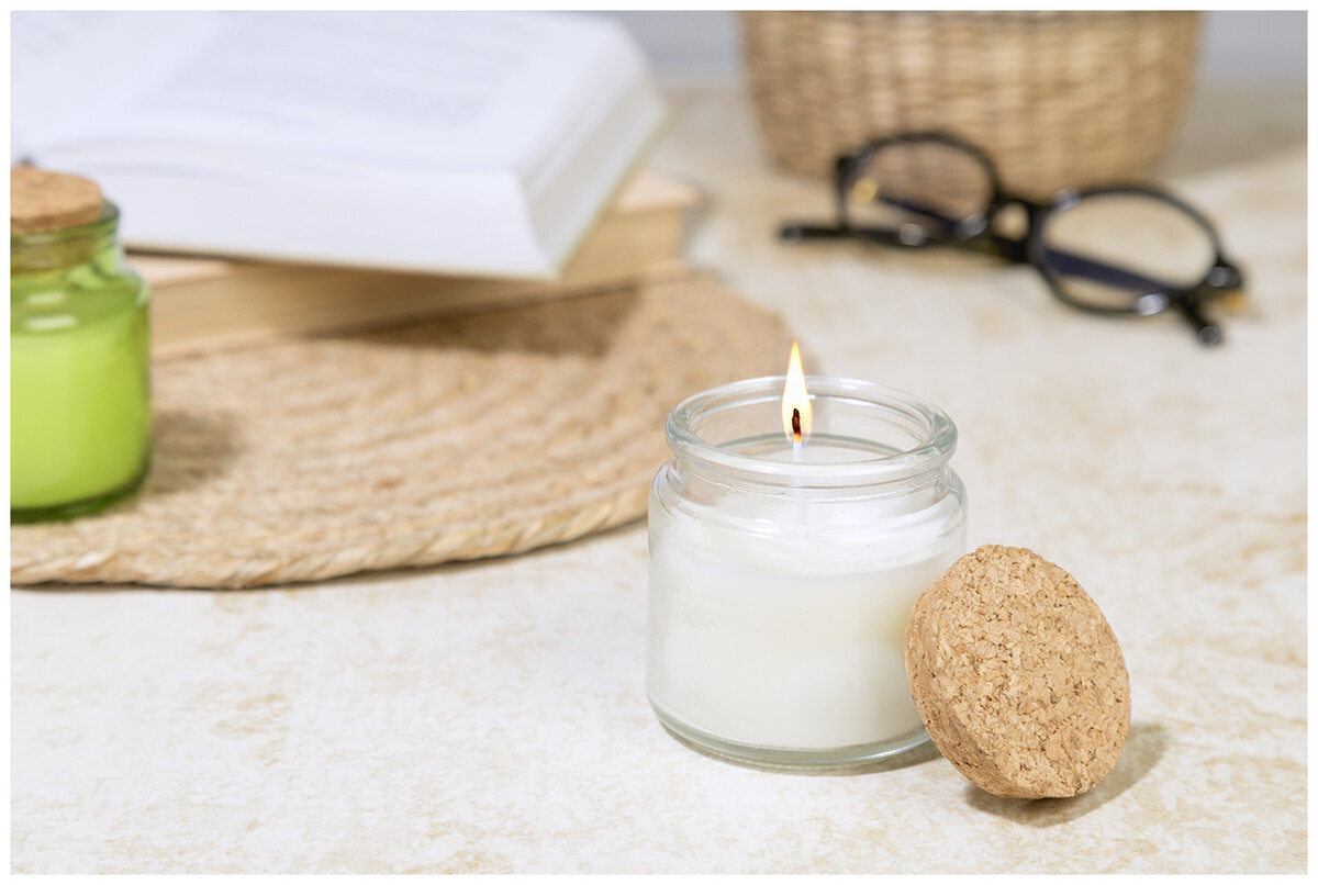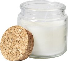 Vosková svíčka z rostlinného vosku s vůní vanilky ve skleněném svícnu s víčkem z přírodního korku. S 80 gramy vosku. Doba hoření: 16 hodin. V krabičce z kraftového papíru.