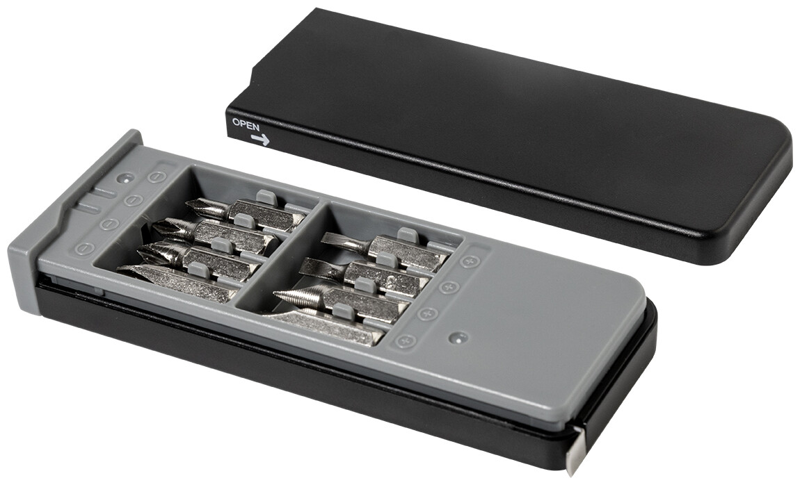 Kompaktní sada nářadí v pouzdře z recyklovaného ABS materiálu s 8 šroubovacími bity a vestavěným 1m metrem.