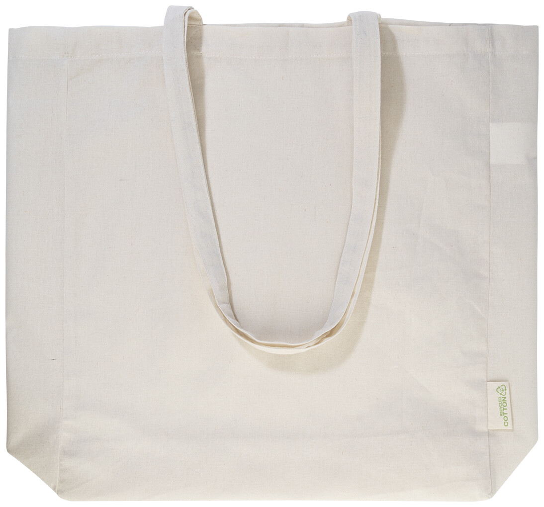 Nákupní taška s klínkem a dlouhými uchy ze 70 % recyklované bavlny a 30 % RPET polyesteru, 140 g/m2. S výraznou etiketou o recyklované bavlně.