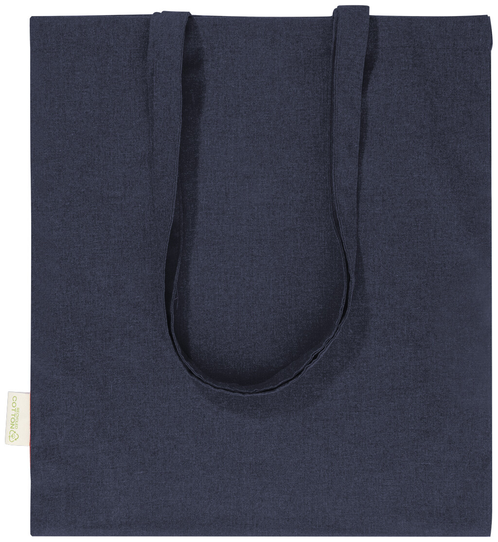 Nákupní taška s dlouhými uchy ze 70 % recyklované bavlny a 30 % RPET polyesteru, 140 g/m2. S výraznou etiketou o recyklované bavlně.