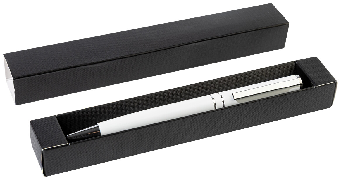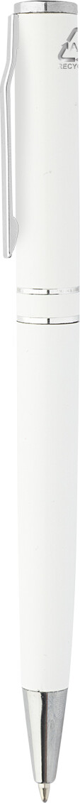 Kuličkové pero z recyklovaného hliníku s chromovanými částmi a kroužky. V černé dárkové krabičce. S modrou náplní.