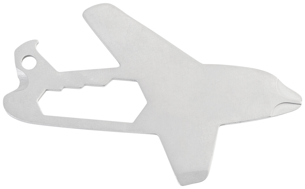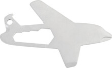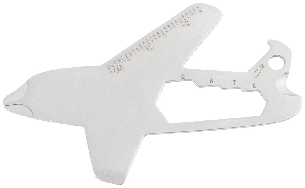 Přívěsek na klíče s multifunkčním nástrojem ve tvaru letadla z recyklované nerezové oceli s otvírákem na lahve, pravítkem, křížovým a plochým šroubovákem, imbusovým klíčem a štípačkou na drát.