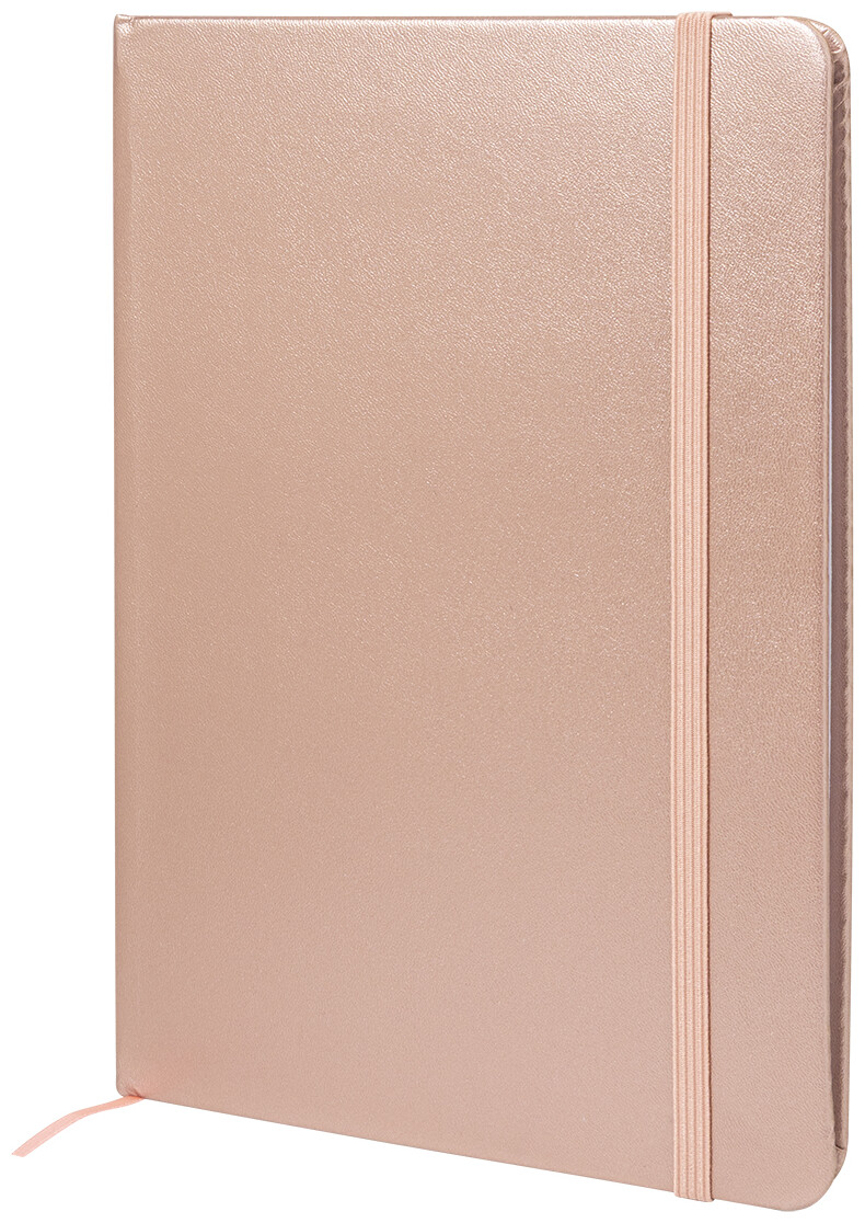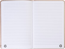 Blok A5 s potahem z recyklované PU kůže s metalickou úpravou se 100 linkovanými listy z recyklovaného papíru. S barevnou záložkou a gumičkou.