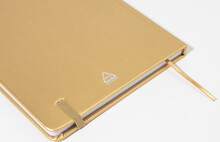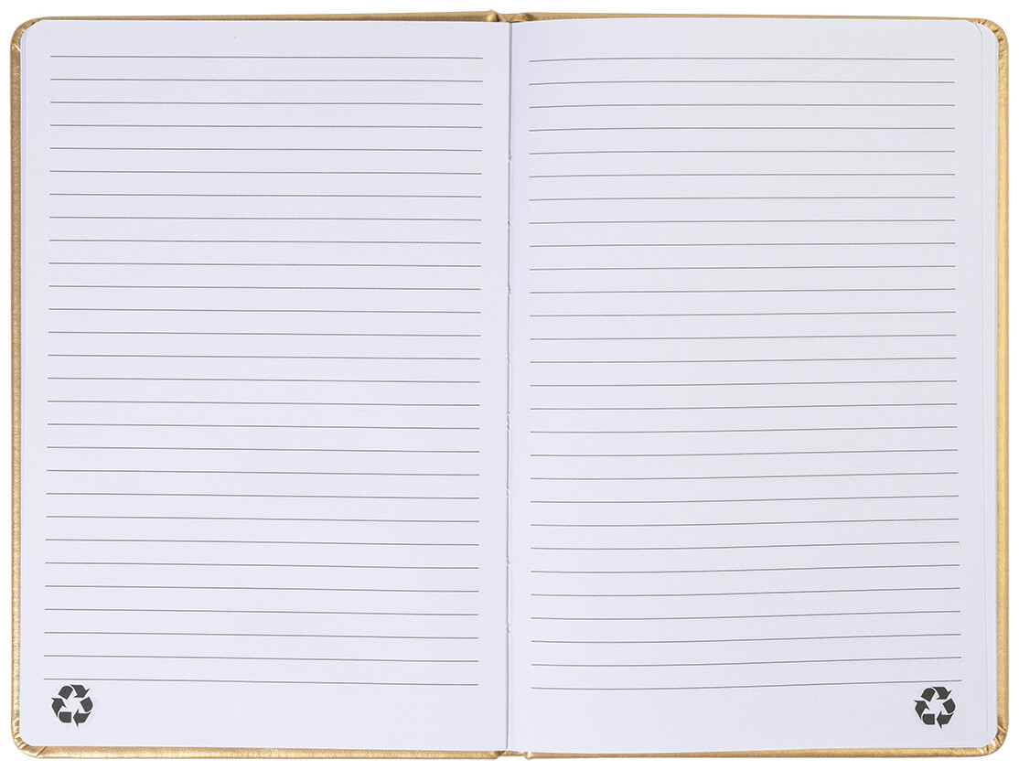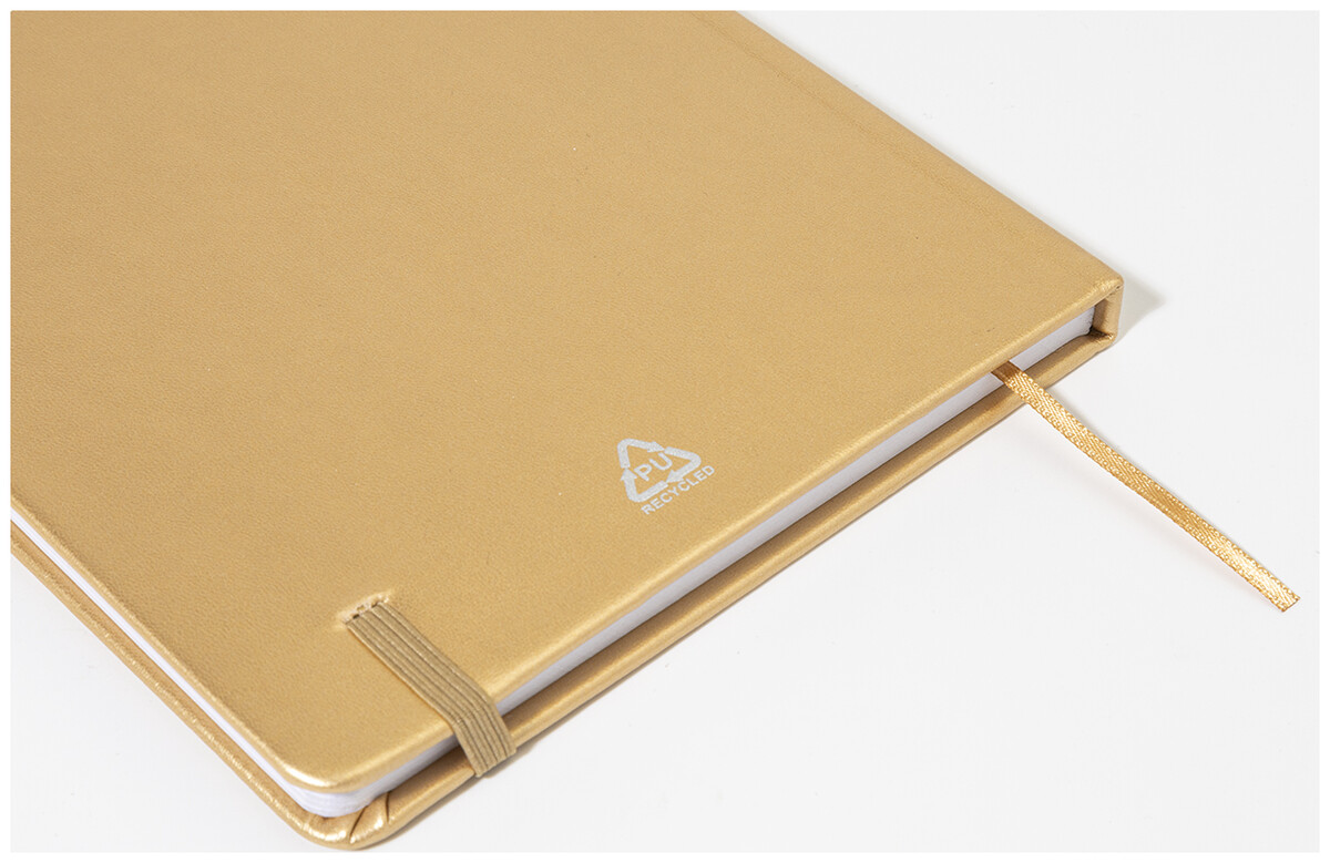 Blok A5 s potahem z recyklované PU kůže s metalickou úpravou se 100 linkovanými listy z recyklovaného papíru. S barevnou záložkou a gumičkou.