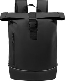 Voděodolný batoh s rolovacím vrškem z měkké recyklované PU kůže s hlavní přihrádkou na zip a zapínáním na přezku, přední kapsou s voděodolným zipem, polstrovanou přihrádkou na notebook (15") a reflexním proužkem. S polstrovanými zády a ramenními popruhy. S výraznou nálepkou z recyklované PU kůže.