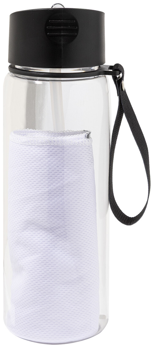 Chladicí sportovní ručník z RPET polyesteru v RPET sportovní lahvi s PP víčkem typu flip-top, integrovaným brčkem a přenosným popruhem. Objem 800 ml. Neobsahuje BPA. Není vhodná pro sycené nápoje. Velikost ručníku: 30 × 80 cm.
