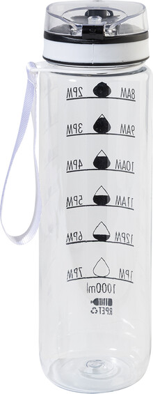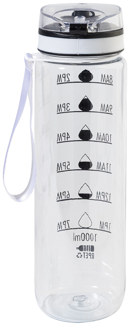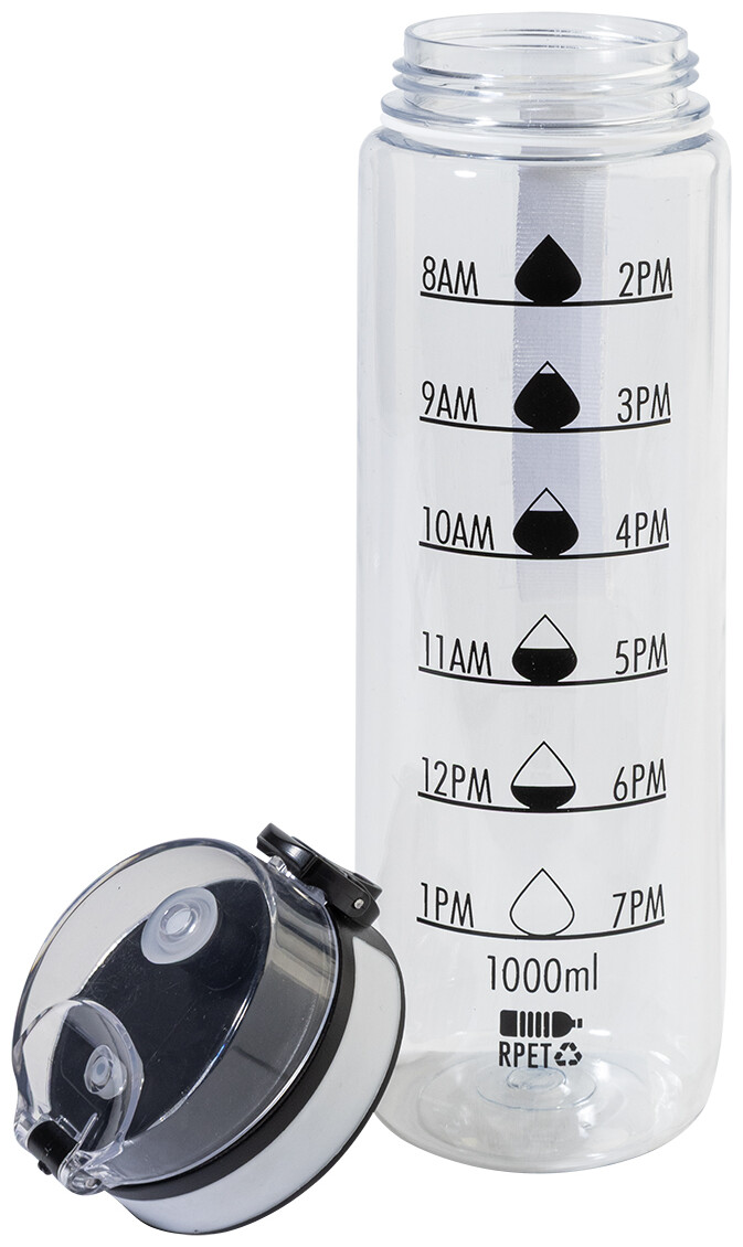 Sportovní láhev z matného RPET s motivačním objemovým a časovým značením, s automaticky otevíratelným odklápěcím víčkem s bezpečnostním zámkem a poutkem na nošení. 1000 ml. Bez BPA. Nevhodné pro sycené nápoje.