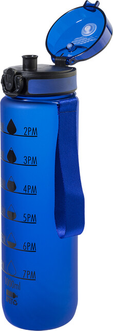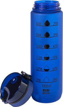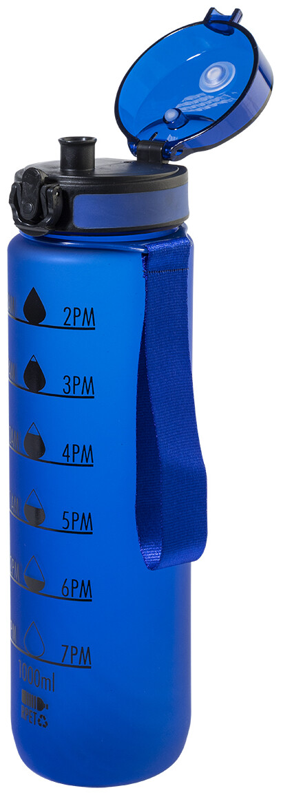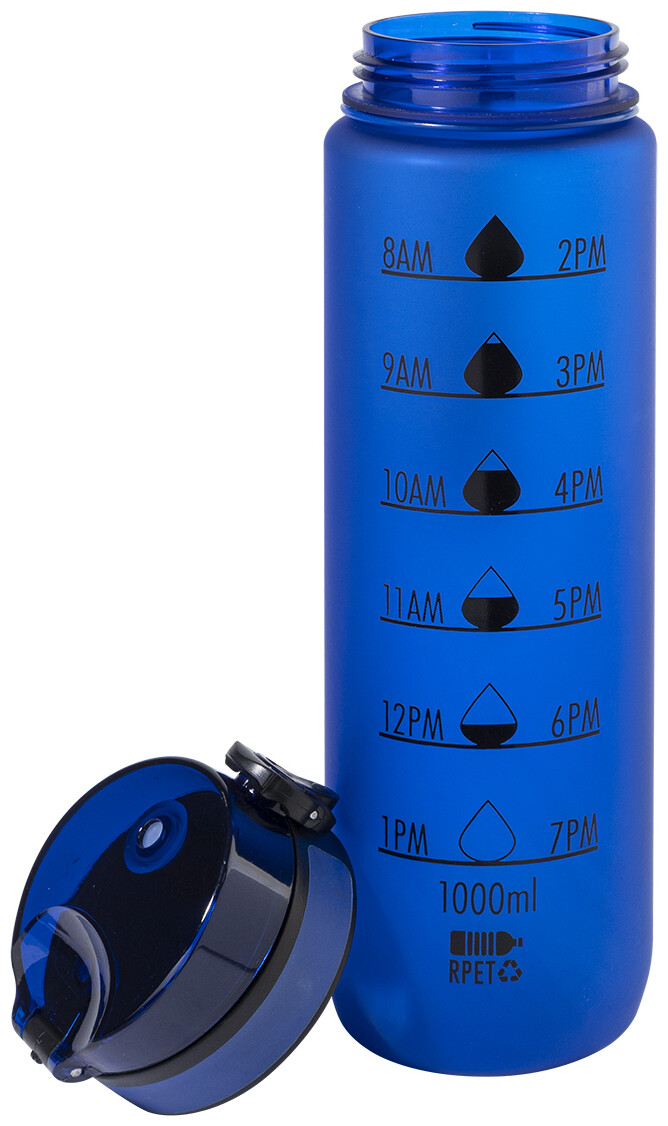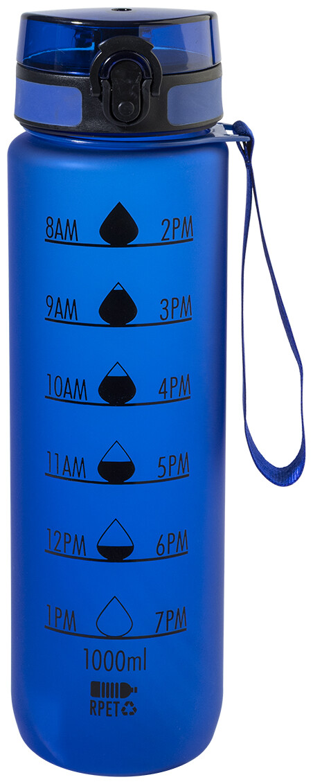 Sportovní láhev z matného RPET s motivačním objemovým a časovým značením, s automaticky otevíratelným odklápěcím víčkem s bezpečnostním zámkem a poutkem na nošení. 1000 ml. Bez BPA. Nevhodné pro sycené nápoje.