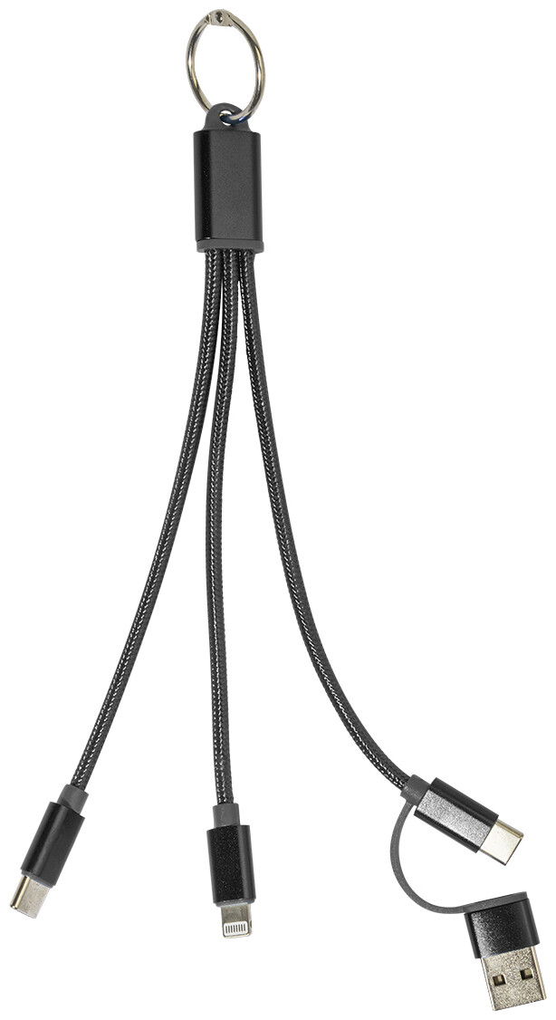 Nabíjecí kabel USB-C z recyklovaného hliníku a RPET s přívěskem na klíče. S konektory micro USB, USB-C a Lightning. S USB a USB-C vstupy.