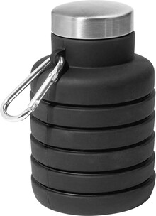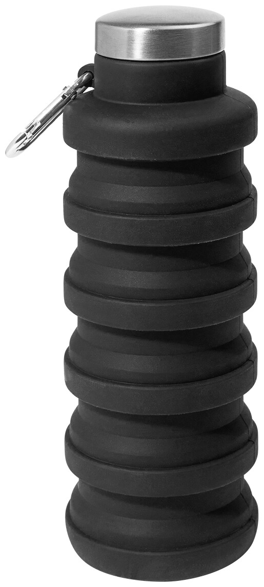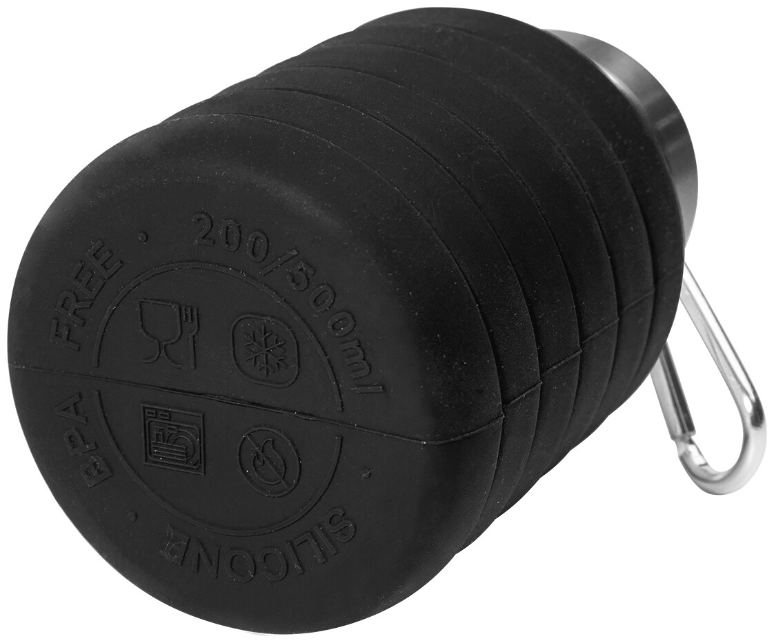 Skládací silikonová láhev s víčkem z nerezové oceli a hliníkovou karabinou. 500 ml