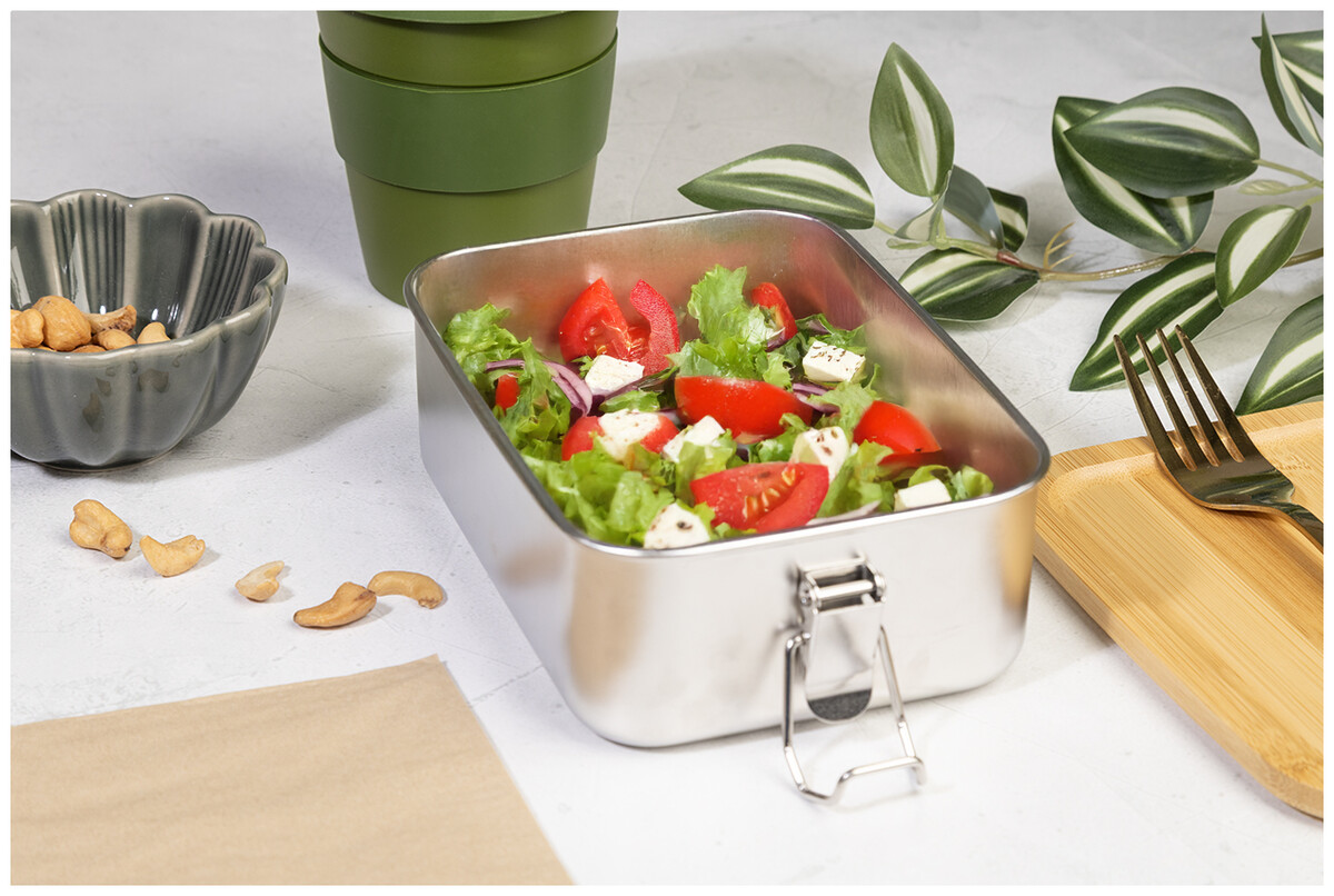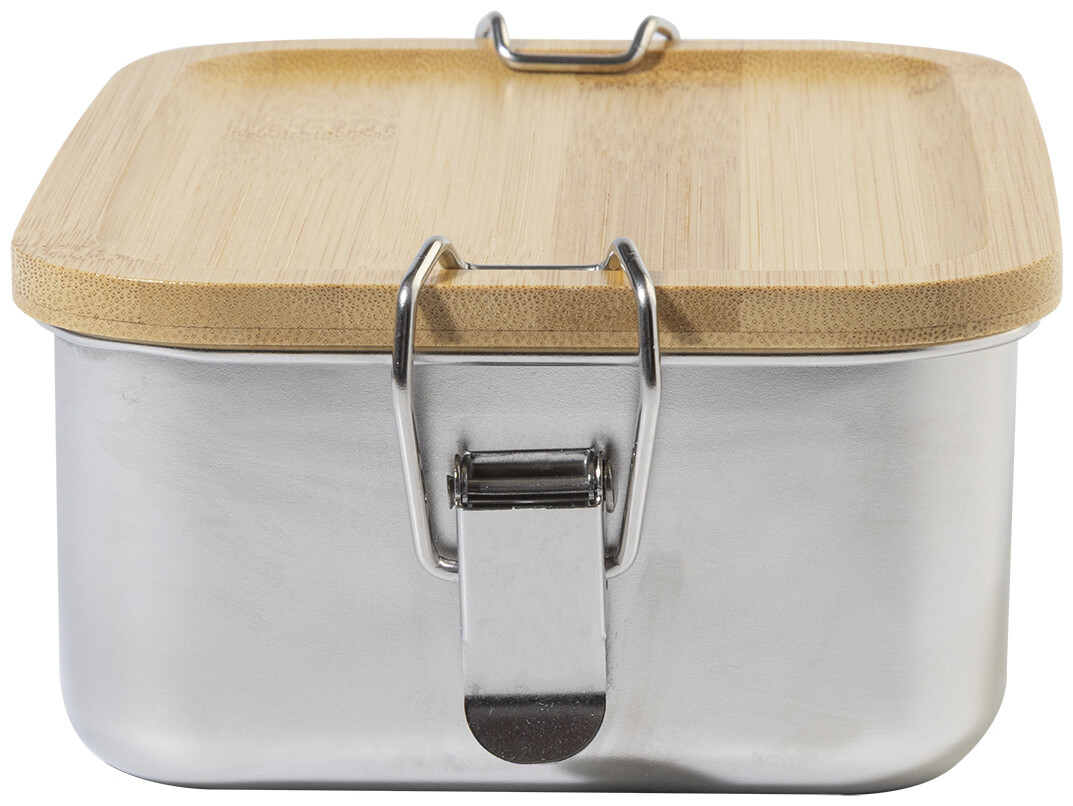 Box na jídlo z recyklované nerezové oceli s bambusovým víkem a bezpečným zapínáním na přezku, 750 ml.