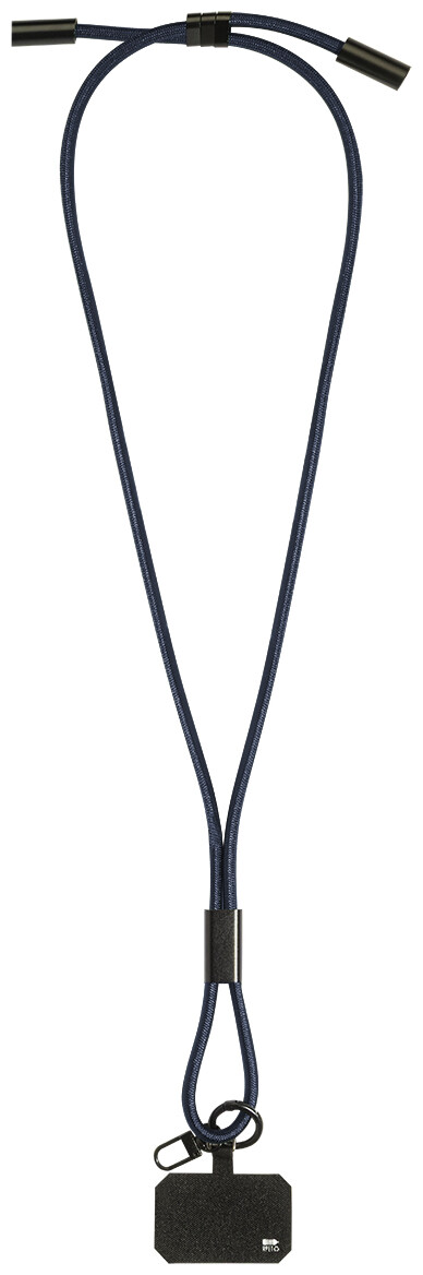 Šňůrka s držákem na mobil z RPET s vložkou pro telefon, karabinou a integrovaným nabíjecím kabelem USB-C na USB-C se skrytými konektory. Podporuje rychlé nabíjení a přenos dat PD 60W.