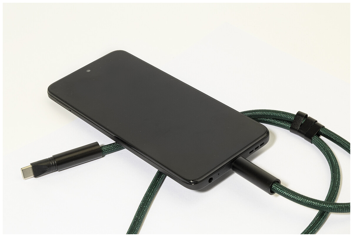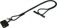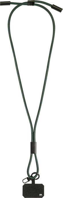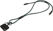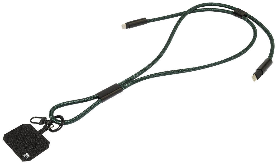 Šňůrka s držákem na mobil z RPET s vložkou pro telefon, karabinou a integrovaným nabíjecím kabelem USB-C na USB-C se skrytými konektory. Podporuje rychlé nabíjení a přenos dat PD 60W.